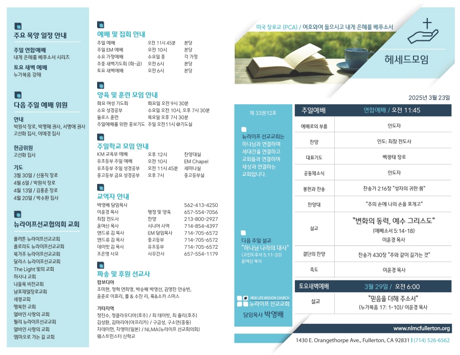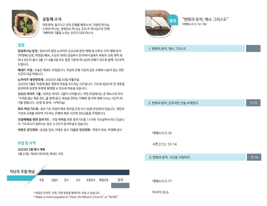 2025년 3월 23일 주보 Publish on March 22,2025 | NLMC 페이지 정보 작성자 NLMC 댓글 0건 조회 1,316회 작성일 25-03-22 12:17 목록 본문 주보 이전글2025년 3월 30일 주보 25.03.29 다음글2025년 3월 16일 주보 25.03.15 댓글 0 댓글목록 등록된 댓글이 없습니다. 목록