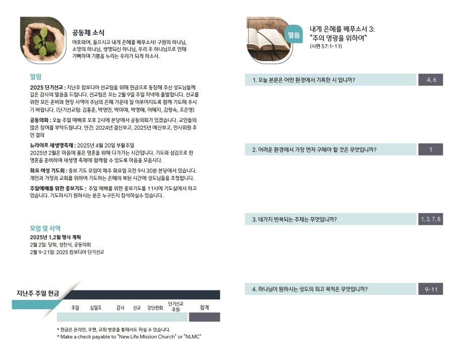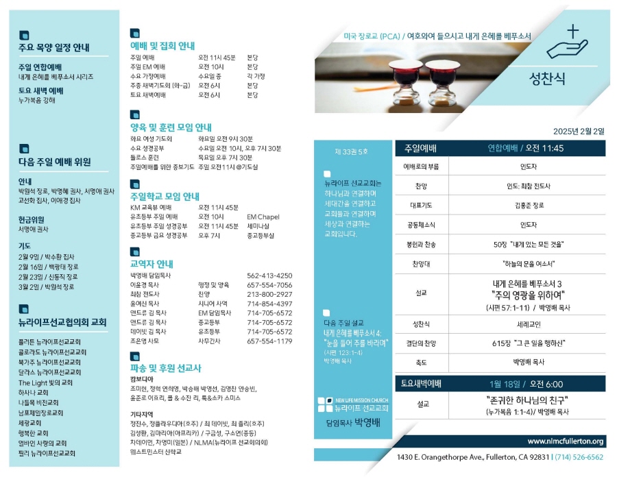 2025년 2월 2일 교회소식 Publish on February 01,2025 | NLMC 페이지 정보 작성자 NLMC 댓글 0건 조회 1,417회 작성일 25-02-01 14:02 목록 본문 주보 이전글2025년 2월 9일 주보 25.02.08 다음글2025년 1월 26일 주보 25.01.25 댓글 0 댓글목록 등록된 댓글이 없습니다. 목록