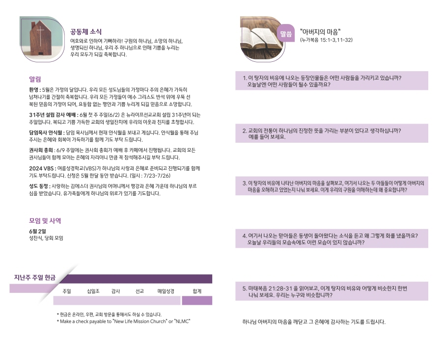 2024년 5월 26일 주보 Publish on May 25,2024 | NLMC 페이지 정보 작성자 NLMC 댓글 0건 조회 1,855회 작성일 24-05-25 09:09 목록 본문 주보 이전글2024년 6월 2일 주보 24.06.01 다음글2024년 5월 19일 주보 24.05.18 댓글 0 댓글목록 등록된 댓글이 없습니다. 목록