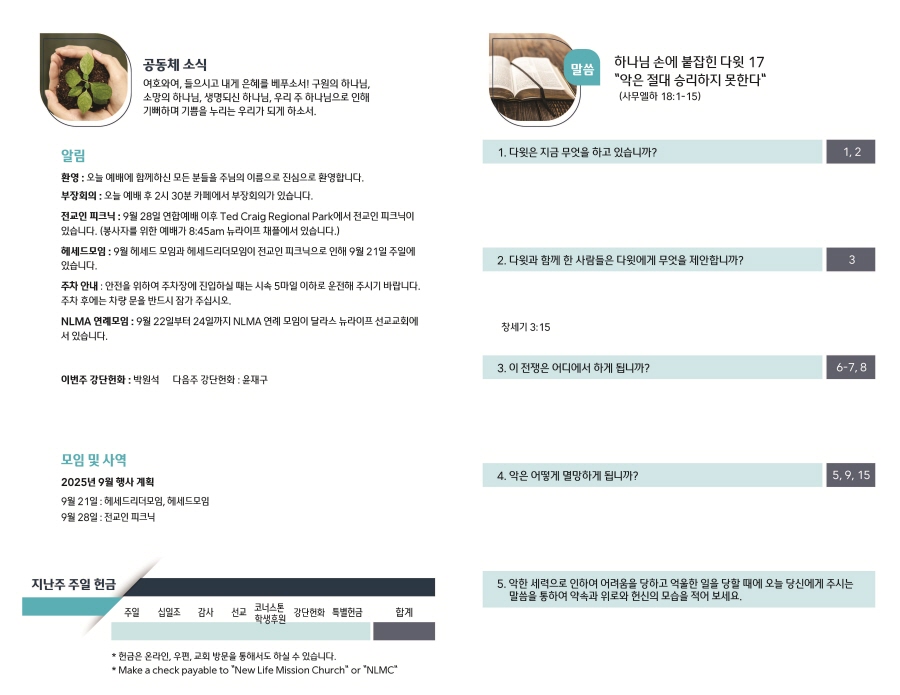 2025년 9월 14일 주보 Publish on September 13,2025 | NLMC 페이지 정보 작성자 NLMC 댓글 0건 조회 559회 작성일 25-09-13 11:59 목록 본문 주보 이전글2025년 9월 21일 주보 25.09.20 다음글2025년 9월 7일 주보 25.09.06 댓글 0 댓글목록 등록된 댓글이 없습니다. 목록