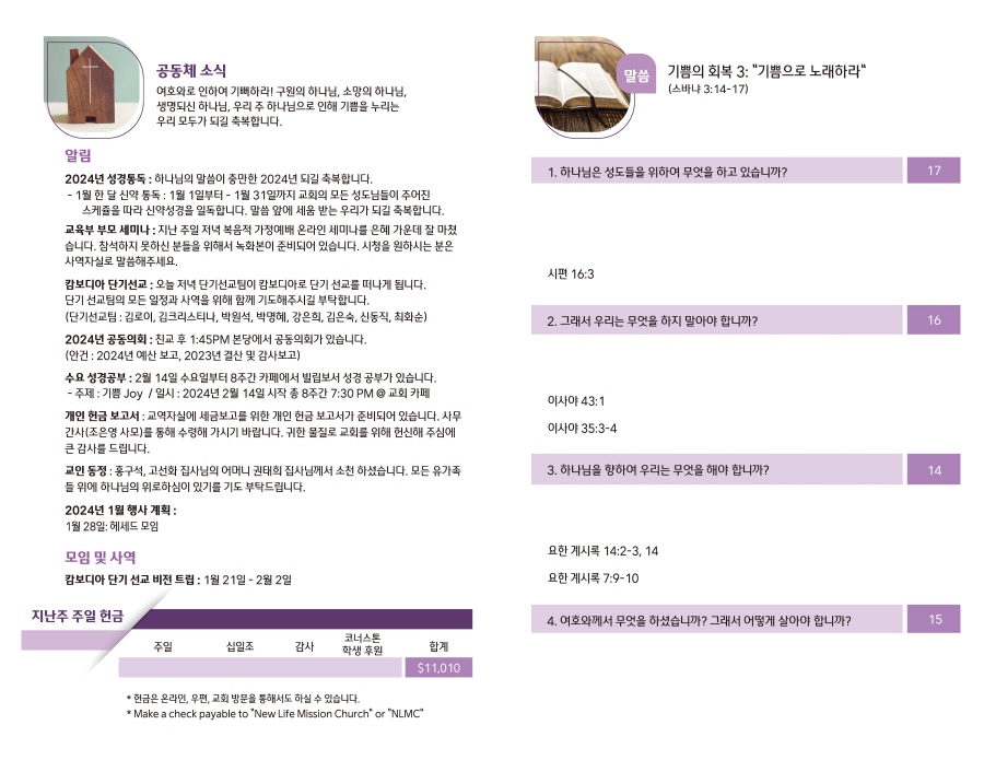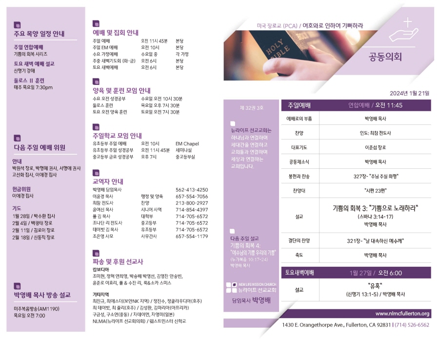 2024년 1월 21일 주보 Publish on January 20,2024 | NLMC 페이지 정보 작성자 NLMC 댓글 0건 조회 2,022회 작성일 24-01-20 10:27 목록 본문 주보 이전글2024년 1월 28일 주보 24.01.27 다음글2024년 1월 14일 주보 24.01.13 댓글 0 댓글목록 등록된 댓글이 없습니다. 목록