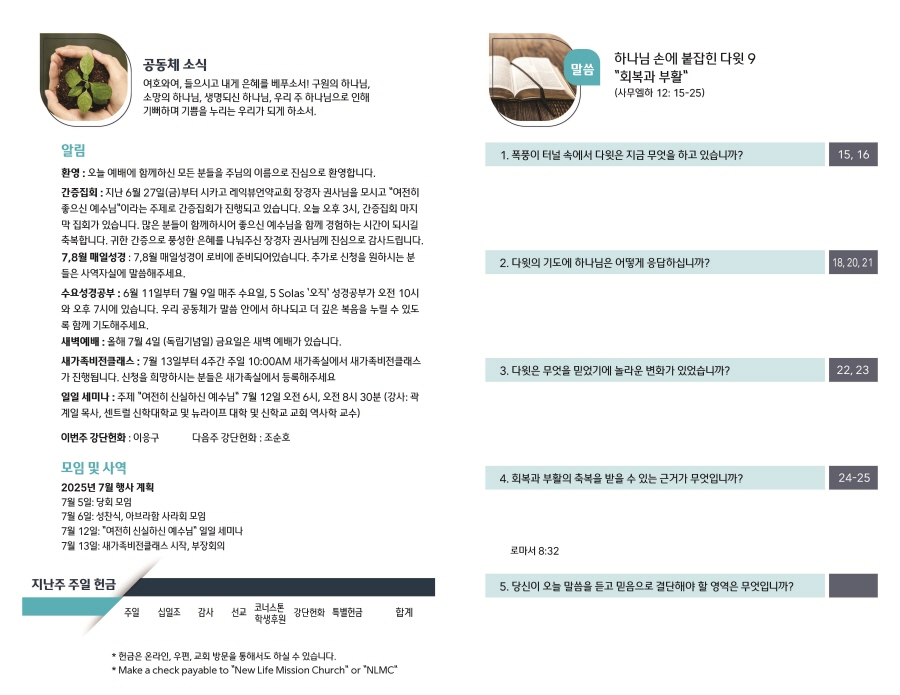 2025년 6월 29일 주보 Publish on June 28,2025 | NLMC 페이지 정보 작성자 NLMC 댓글 0건 조회 985회 작성일 25-06-28 11:41 목록 본문 주보 이전글2025년 7월 6일 주보 25.07.05 다음글2025년 6월 22일 주보 25.06.21 댓글 0 댓글목록 등록된 댓글이 없습니다. 목록
