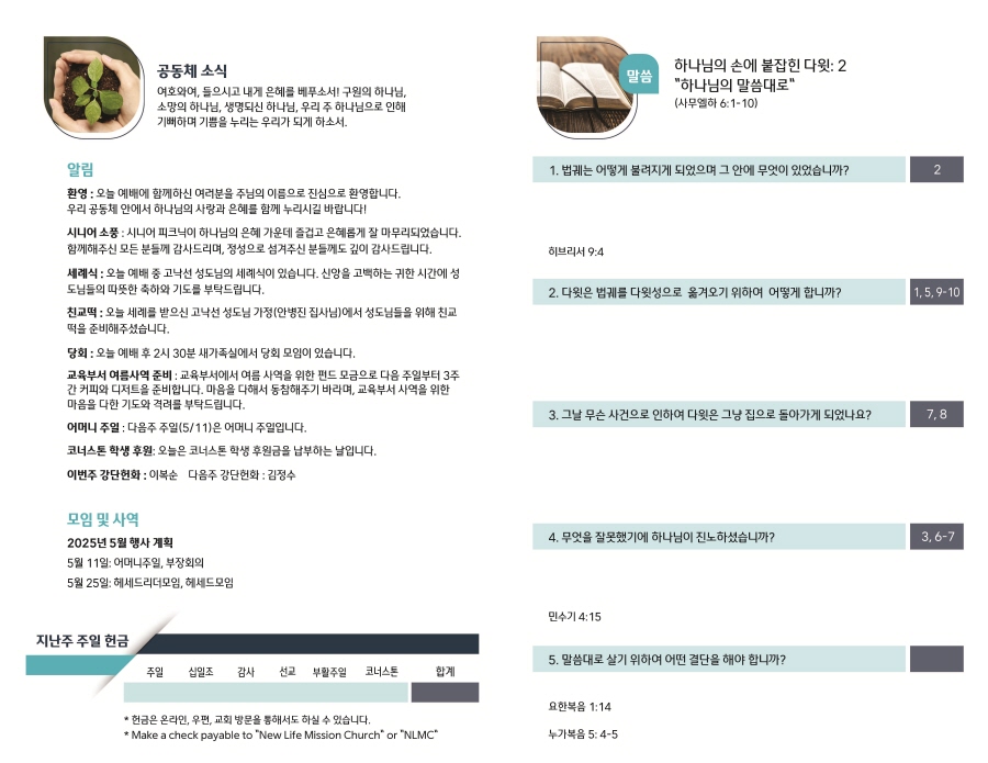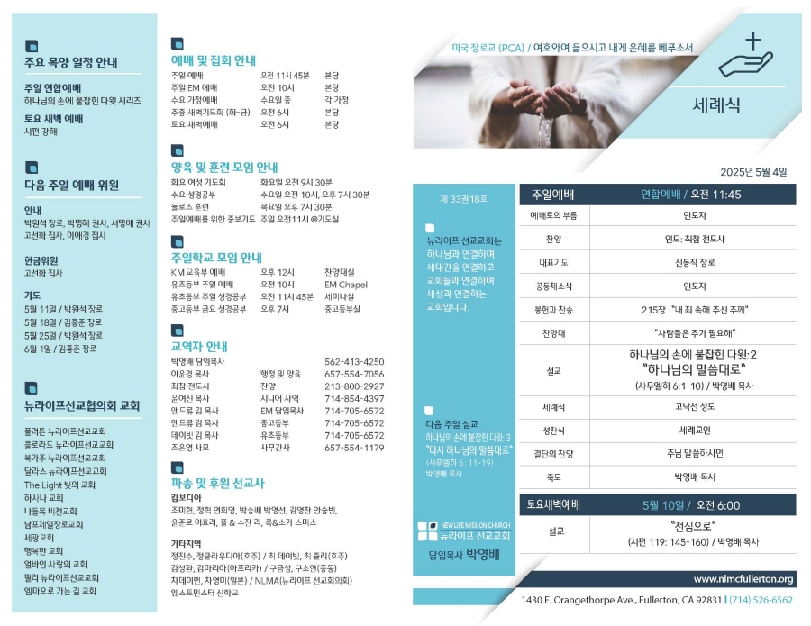2025년 5월 4일 주보 Publish on May 03,2025 | NLMC 페이지 정보 작성자 NLMC 댓글 0건 조회 1,250회 작성일 25-05-03 10:47 목록 본문 주보 이전글2025년 5월 11일 주보 25.05.10 다음글2025년 4월 27일 주보 25.04.27 댓글 0 댓글목록 등록된 댓글이 없습니다. 목록