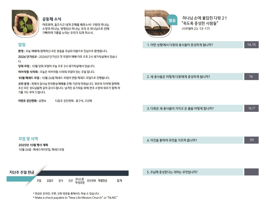 2025년 10월 12일 주보 Publish on October 12,2025 | NLMC 페이지 정보 작성자 NLMC 댓글 0건 조회 170회 작성일 25-10-12 10:15 목록 본문 주보 이전글2025년 10월 19일 주보 25.10.18 다음글2025년 10월 5일 주보 25.10.04 댓글 0 댓글목록 등록된 댓글이 없습니다. 목록