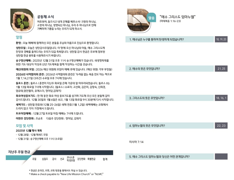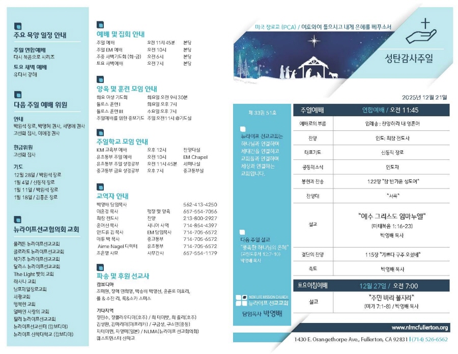 2025년 12월 21일 주보 Publish on December 20,2025 | NLMC 페이지 정보 작성자 NLMC 댓글 0건 조회 63회 작성일 25-12-20 10:55 목록 본문 주보 다음글2025년 12월 14일 주보 25.12.13 댓글 0 댓글목록 등록된 댓글이 없습니다. 목록