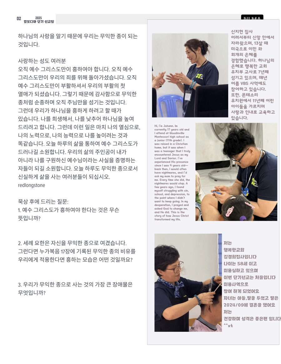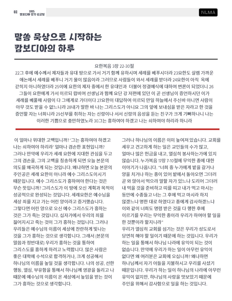 [선교지 편지] 2025년 2월 14일 캄보디아 단기선교팀 소식 페이지 정보 Writer : NLMC Date : 2025-02-14 View : 456 목록 본문 단기 선교팀 소식 입니다. 이전글2025년 2월 15일 단기선교팀 소식 25.02.14 다음글2025년 2월 13일 캄보디아 단기선교팀 소식 25.02.14 LIST