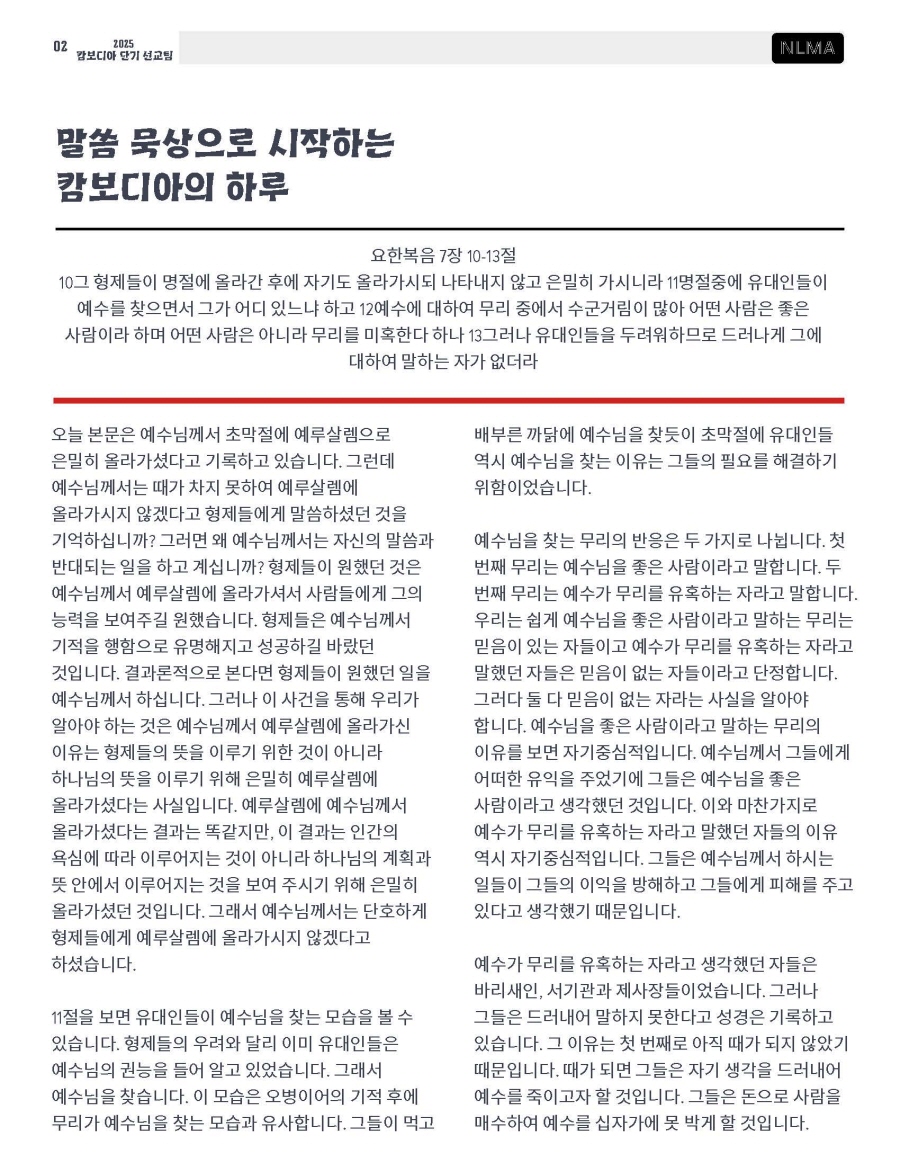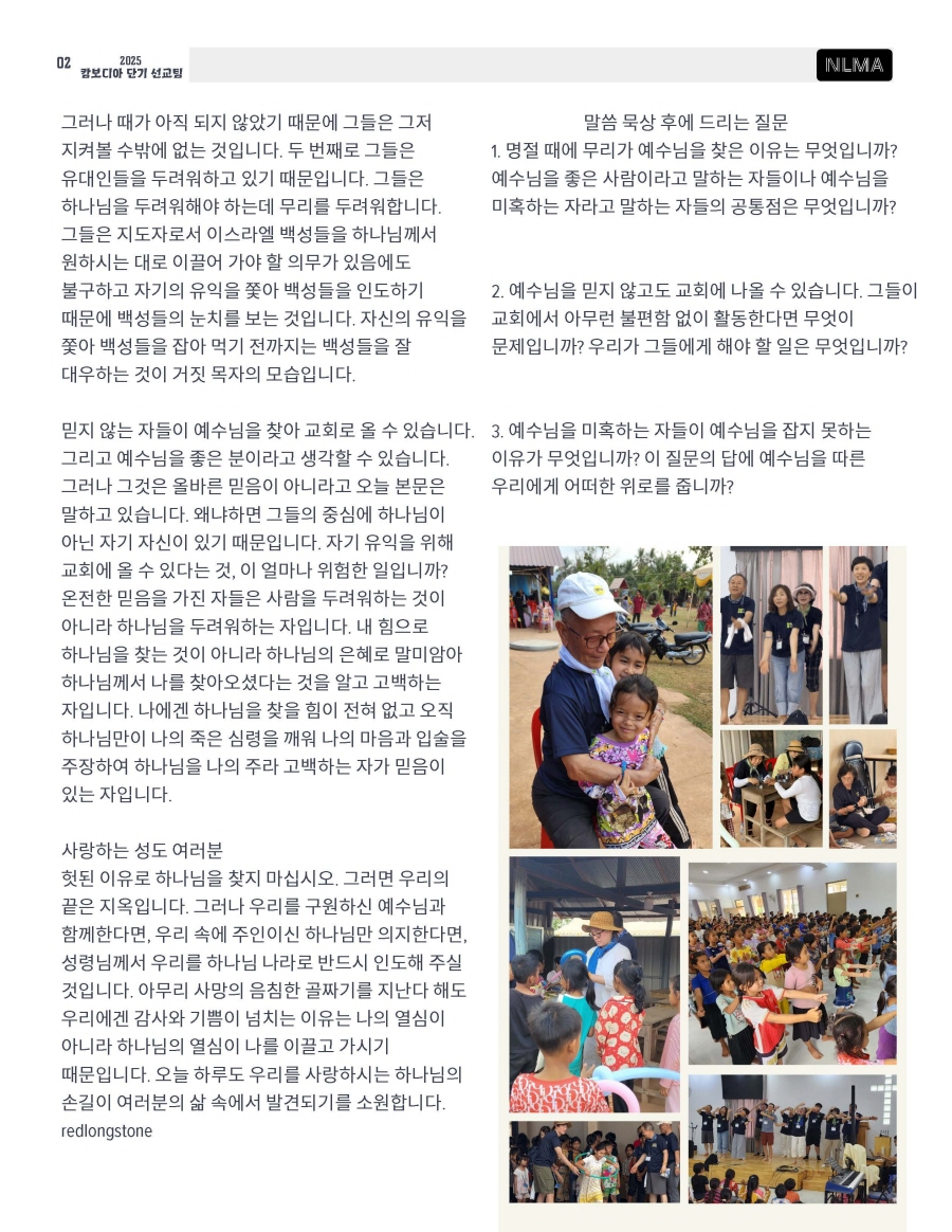 [선교지 편지] 2025년 2월 15일 단기선교팀 소식 페이지 정보 Writer : NLMC Date : 2025-02-14 View : 558 목록 본문 2025년 2월 15일 단기선교팀 소식 이전글2025년 2월 16일 캄보디아 단기선교팀 소식 25.02.22 다음글2025년 2월 14일 캄보디아 단기선교팀 소식 25.02.14 LIST