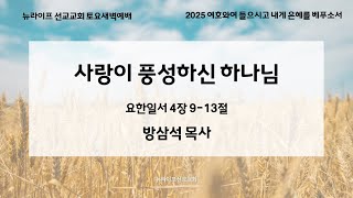 토요예배 토요예배 토요예배 토요예배 카테고리 전체2025202420222023 127 사랑이 풍성하신 하나님 요일 4:9-13 | 방삼석 목사 [달라스 뉴라이프선교교회] 2025.12.06 2025-12-6 토요 새벽집회 제목 : 사랑이 풍성하신 하나님 본문 : 요일 4:9-13 설교 : 방삼석 목사 [달라스 뉴라이프선교교회] https://www.youtube.com/embed/A9ihv_UExfU 126 당신은 하나님과 동행하십니까? 히브리서 11:5-6 | 신지훈 목사 [콜로라도 뉴라이프선교교회] 2025.11.29 2025-11-29 토요 새벽집회 제목 : 당신은 하나님과 동행하십니까? 본문 : 히브리서 11:5-6 설교 : 신지훈 목사 [콜로라도 뉴라이프선교교회] https://www.youtube.com/embed/uJWcyyreZOM 125 다 함께 성벽을 세우자 느헤미야 3:1-32 | 박영배 목사 2025.11.22 2025-11-22 토요 새벽집회 제목 : 다 함께 성벽을 세우자 본문 : 느헤미야 3:1-32 설교 : 박영배 목사 https://www.youtube.com/embed/AQs1UloWvj4 124 아직도 소망이 있나니 에스라 10:1-8 | 박영배 목사 2025.11.15 2025-11-15 토요 새벽집회 제목 : 아직도 소망이 있나니 본문 : 에스라 10:1-8 설교 : 박영배 목사 https://www.youtube.com/embed/7PCsm4egPI4 123 일을 시작하시고 완성하시는 하나님 에스라 6:13-22 | 박영배 목사 2025.11.08 2025-11-8 토요 새벽집회 제목 : 일을 시작하시고 완성하시는 하나님 본문 : 에스라 6:13-22 설교 : 박영배 목사 https://www.youtube.com/embed/S6MXpFk8Iew 122 회복의 시작 에스라 1:1-6 | 박영배 목사 2025.11.01 2025-11-1 토요 새벽집회 제목 : 회복의 시작본문 : 에스라 1:1-6 설교 : 박영배 목사 https://www.youtube.com/embed/gqUKiSwxO8s 121 또 은혜를 베푸시는 하나님 역대하 32:24-33 | 이윤경 목사 2025.10.25 2025-10-25 토요 새벽집회 제목 : 또 은혜를 베푸시는 하나님 본문 : 역대하 32:24-33 설교 : 이윤경 목사 https://www.youtube.com/embed/2w0OWE_-wLA 120 망령되이 행하지 말라 역대하 28:16-27 | 박영배 담임 목사 2025.10.18 2025-10-18 토요 새벽집회 제목 : 망령되이 행하지 말라 본문 : 역대하 28:16-27 설교 : 박영배 담임 목사 https://www.youtube.com/embed/29WIgjb4rlc 119 주님의 다스림 안에서 용기를 내라 역대하 23:1-15 | 박영배 담임 목사 2025.10.11 2025-10-11 토요 새벽집회 제목 : 주님의 다스림 안에서 용기를 내라 본문 : 역대하 23:1-15 설교 : 박영배 담임 목사 https://www.youtube.com/embed/rCHR1Yke8F4 열린1페이지 2페이지 3페이지 4페이지 5페이지 6페이지 7페이지 8페이지 9페이지 10페이지 다음 맨끝 검색 검색대상 제목내용제목+내용글쓴이글쓴이(코) 검색어 필수 검색 닫기